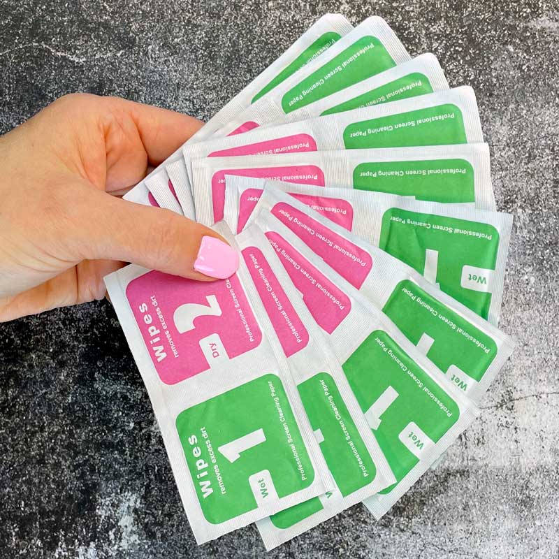 Sammelpackung Bildschirmreinigungstücher, die effektiv Schmutz, Fingerabdrücke und klebrige Reste vom Handy oder Laptop entfernen. Auch für Kameralinsen, Uhren oder Schmuck geeignet. Taschenformat, ganz einfach für unterwegs und für die Brieftasche.