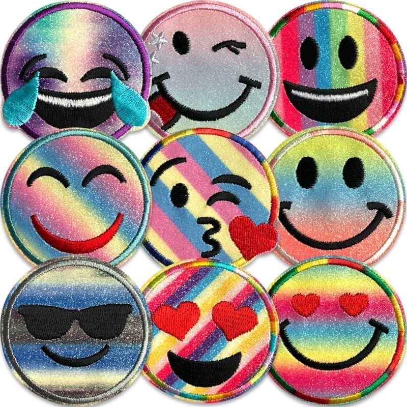 Bling Smileys ist ein schönes, glitzerndes Paket mit neun Smileys in verschiedenen Ausführungen. Ein Smiley hat einen Durchmesser von 6,2 cm und ist zum Aufbügeln auf Stoffe.
