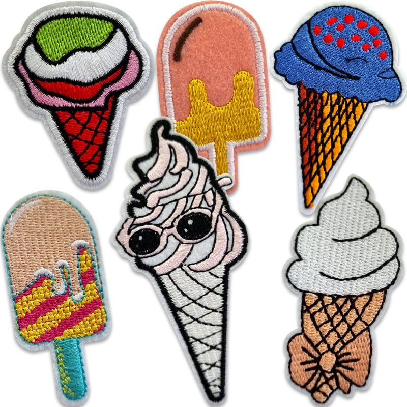 Das Paket enthält sechs gestickte Eissorten in verschiedenen Größen. Die Bilder sind zum Aufbügeln, und eigenen sich deshalb toll zum Flicken oder Verschönern von Kleidungsstücken. Sie sind unterschiedlich hoch, zwischen 5,5 bis 10 cm. Eine Bügelanleitung ist beim Kauf dabei.