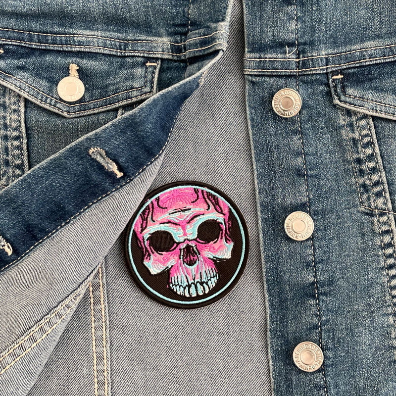 Hier kannst du dein Exemplar dieses lila Totenkopfes bestellen. Das Bild ist zum Aufbügeln auf Kleider und andere Stoffprodukte wie z.B. Taschen gut geeignet. Die Größe beträgt 7,4 cm. Das Bügelbild kann auch gut zum Flicken von Löchern benutzt werden, oder einfach zum Verschönern von Kleidern, Taschen oder Mützen.