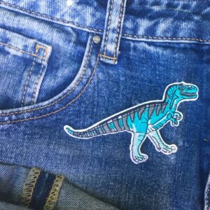 Mit diesem T-Rex können kleine Löcher in Kinderhosen oder -pullovern ganz leicht geflickt werden. Einfach der Bügelanleitung folgen, das Bild aufs Loch bügeln – schon halten die Hosen noch eine ganze Weile! Außerdem wird so verhindert, dass das Loch immer größer wird. Die Größe des Bildes beträgt 10 cm, und es ist sofort auf dem Weg zu dir!